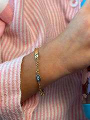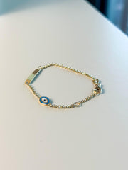 Cherish your little one with this stunning 14k solid gold baby name tag bracelet, designed to celebrate individuality and style. Featuring a beautiful name tag, this bracelet adds a personal touch to your child’s jewelry collection. The delicate blue evil eye charm offers protection and good luck, making this piece not only fashionable but also meaningful. Crafted on a sturdy cable chain, this bracelet is comfortable for everyday wear and perfect for special occasions. A thoughtful gift for baby showers, birthdays, or any milestone, this bracelet is a precious keepsake that will be treasured for years to come.